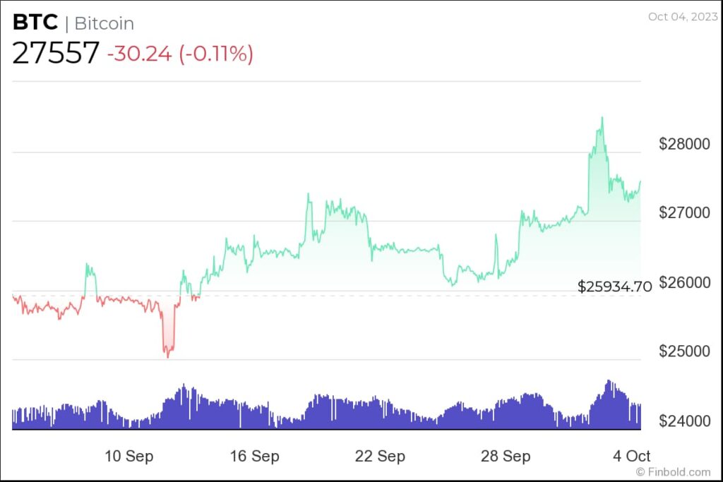 Spesifik olarak, Bitcoin, yayınlandığı sırada 27.557 $ fiyatından işlem görüyordu. BTC gün içinde %0,11’lik bir düşüş kaydetti ancak önceki haftaya göre hala %5’lik bir kazanç ve aylık grafikte %6,1’lik bir artış kaydetti.