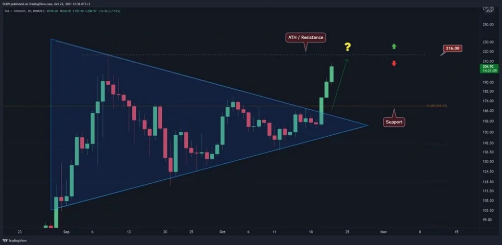 Bu hafta SOL, fiyatta %35’in üzerinde artışla (mavi renkli) büyük flamanın üzerine çıktıktan sonra mükemmel bir performans sergiledi. Yükselişi onayladıktan sonra Solana, aynı zamanda tüm zamanların en yüksek seviyesi olan 216 dolardan kilit direnç çizgisine doğru çok hızlı hareket etti.