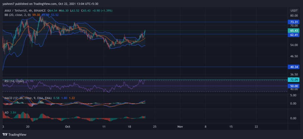 AVAX son 24 saatte %6.02 arttı. Altcoin, önceki direncini kırdı ve 68 dolara kadar yükseliş yaşadı. Yeni direnç seviyesi 73.31 dolar olarak görülüyor. Ticaret fiyatı, Bollinger bantlarının üst bandına yakın ve satın alma gücünün üstünlüğüne işaret ediyor.