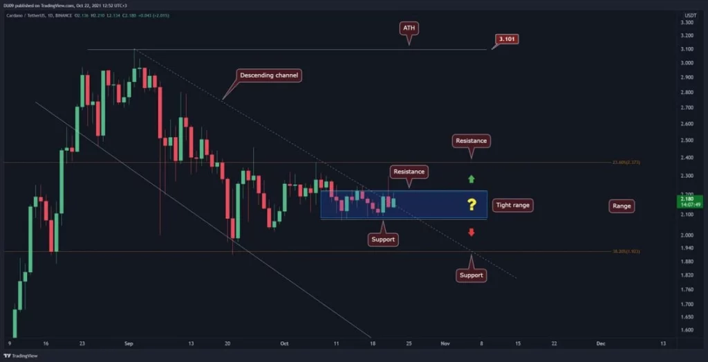 Cardano, birkaç denemeden sonra alçalan kanalından ayrılmayı başardı. Şimdi, ADA’nın fiyatı kendisini 2 dolar (destek) ile 2,2 dolar (direnç) arasında dar bir aralıkta bulunuyor. Bu fiyat hareketi, Eylül ayı sonlarında 2 ile 2,4 dolar arasında belirlenen daha büyük bir sınırlama içindeydi. Bu nedenle, ADA o kanaldan ayrılana kadar trend sabitti. ADA fiyati grafikte belirtilen temel seviyeler arasında yükselebilir.
