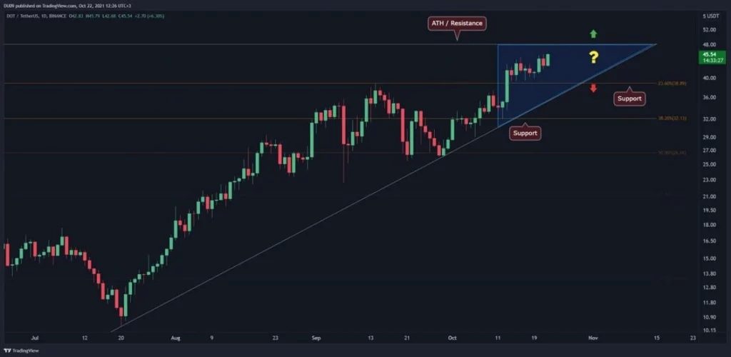Fiyatın önümüzdeki hafta (mavi) zirvede hareket etmesi için hala yer var (tabloya bakın), ancak Kasım ayı başlarında DOT’un fiyatının sonraki adımlarla ilgili bir karar vermesi gerekecek. Tüm zamanların en yüksek seviyesini belirleyebilir mi yoksa ayılar DOT’u 39 ve 32 Dolar’da bulunan destek seviyelerine indirebilir mi? Zaman ve bitcoin’in hareketleri gösterecektir.