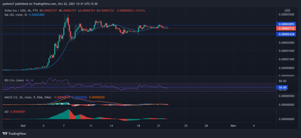 SHIB’nin fiyatı son 24 saatte %4,12 düştü ve 0,0002732 dolardan işlem gördü. Fiyat, 0,00002895 ABD doları olan ve daha sonra konsolidasyona giren ani direncini kıramadı. Destek seviyesi 0.00002428 dolarda kaldı. İşlem fiyatı 20-SMA seviyesinin altındaydı ve bu nedenle satıcıların hakimiyeti vardı.