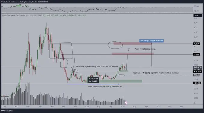 Van de Poppe, ETH dışındaki altcoinler açısından piyasa değerinin “değişmediğini”, 600 milyar dolarlık önemli bir alanı destek için çevirdiğini, “530 günlük aralığın sona erdiğini ve piyasaların bir trend içinde olduğunu” gözlemliyor 1 trilyon dolara doğru devam etmesini beklediğini sözlerine ekledi.