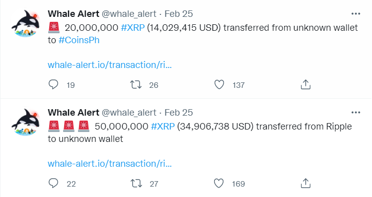 Whale Alert, 25 Şubat’ta iki anonim cüzdan arasında aktarılan XRP’de şaşırtıcı bir miktar tespit etti. O gün 214.952.290 dolar değerinde olan 305.8 milyon XRP’yi değiştirdiler. Şimdiye kadar, XRP fiyatı arttığı için bu miktar 233.131.991 dolar değerinde.