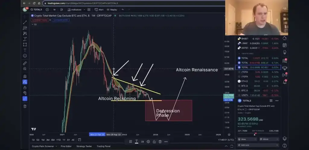 Ne yazık ki birçoğu muhtemelen yeni zirveler görmeyecek. Bu nedenle altcoin piyasasının 323,5 milyar dolar aralığında bir süre harcadığı bir senaryoya sahip olabilirsiniz. Belki sonunda 290 milyar dolar aralığına geri döner ve sonra teslim olur. Belki 2024’te bu durumdan çıkmadan önce depresyon aşamasına daha da düşer.“