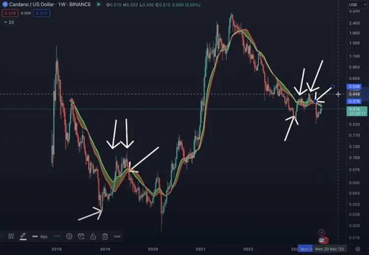 Cowen’a göre ADA, 2023’te, tokenin çift tepe kalıpları oluşturduğu ve ardından teknik analizde 20 haftalık basit hareketli ortalama (SMA) ve 21 haftalık üstel hareketli ortalamanın (EMA) birleşimi olan boğa piyasası destek bandının altına düştüğü 2019’a benzer şekilde yükseldi.