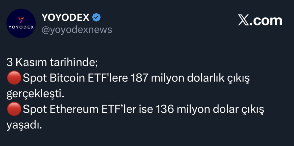 3 Kasım itibarıyla spot Bitcoin ETF’leri 187 milyon dolarlık net çıkış kaydetti. Bu, üst üste dördüncü gün yaşanan çıkış anlamına geliyor. Ethereum ETF’leri de 136 milyon dolar çıkış yaşarken, Solana ETF’leri tam tersine 70 milyon dolarlık girişle beşinci pozitif gününü geçirdi. Analistler, yatırımcıların yorgunluğa rağmen daha yüksek beta varlıklara yöneldiğine dikkat çekiyor.