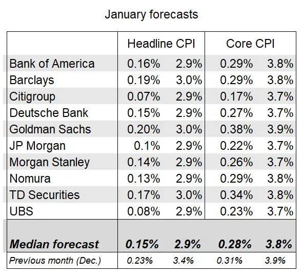 JPMorgan, Bank of America, UBS, Morgan Stanley, Citigroup, Deutsche Bank, Nomura ve RBC, manşet TÜFE enflasyonunun %3,4’ten %2,9’a gerileyeceğini tahmin ediyor. Ancak Barclays, Goldman Sachs, TD Securities ve Wells Fargo %3’e düşüş bekliyor.
