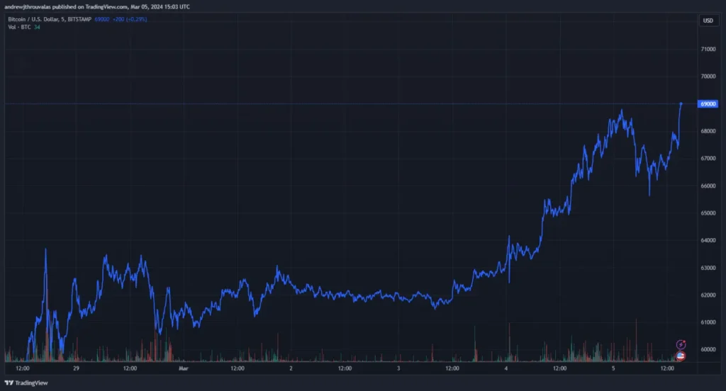 Bitcoin’in fiyatı, Ocak ayında birkaç ABD Bitcoin spot ETF’sinin piyasaya sürülmesinden bu yana hızla yükseldi. Bu, spot BTC’yi, kripto para birimini doğrudan elinde tutamayan bir grup kurumsal alıcı için olası bir yatırım seçeneği haline getirdi. Varlığın Salı günkü rallisi, ABD borsasının açılmasıyla başladı. Bu, ETF’lerin Bitcoin’in günlük işlem hacminde daha büyük bir pay almasıyla büyüyen bir trend. Varlık, yazım sırasında 69.101 dolardan işlem görüyor.