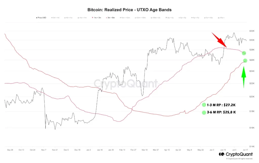 CryptoQuant on-chain analisti Crazzyblockk’a göre, kısa vadeli tutucu (STH) gerçekleşen fiyatı (6 aydan az), yeni yatırımcıların birikim ilgisinde önemli bir düşüşe tanık oldu. Bu kohort, piyasada bir ila üç ay arasında olduğunu söylüyor. Ayrıca, Bitcoin fiyat toparlanması, hem kısa vadeli hem de uzun vadeli (3 – 6 ay) 27.200 Dolar ve 25.800 Dolarda tutulan fiyatların gerçekleşmesi nedeniyle muhtemelen baskı altında. Birleştirilirse, gerçekleşen fiyatları ortalama 28.500 $ civarındadır.