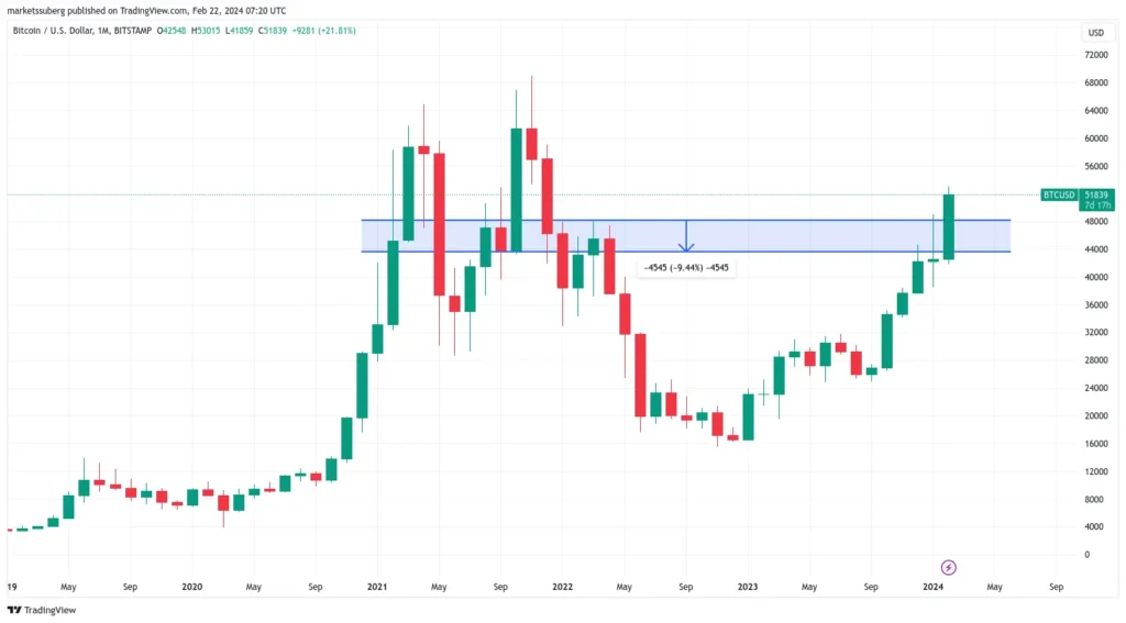 Buna yanıt veren analist Matthew Hyland, 48.000 doların hemen üzerindeki tüm zamanların en yüksek seviyelerinden 0,618 Fibonacci geri çekilme seviyesinin önemine dikkat çekerek genel olarak bu görüşe katıldı.