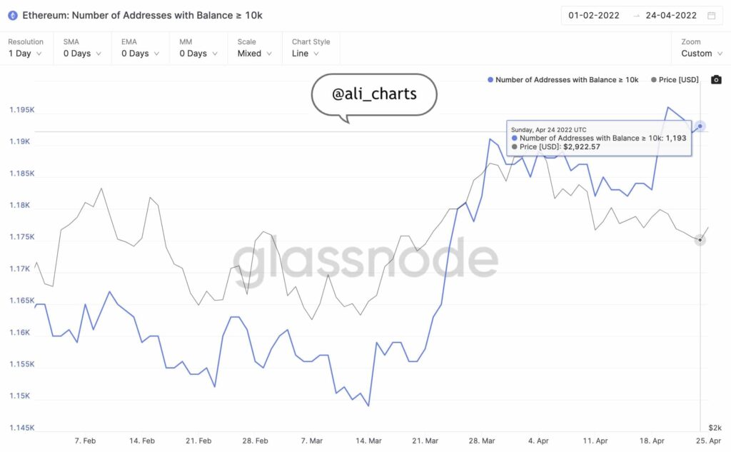2022 yılı için ETH, BTC ile ilgili olarak neredeyse benzer hareketler gösteriyor. Ancak Ethereum balinaları bu zamanlarda düşüşleri satın alıyor. Popüler kripto piyasası analisti Ali Martinez şunları söylüyor :