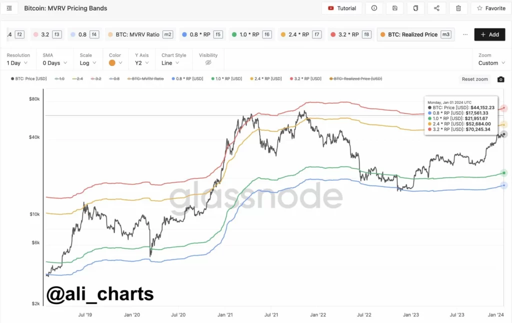 En son analizlerde kripto analisti Ali Martinez, BTC için potansiyel fiyat hedeflerini gösteren bir ölçüm olan Bitcoin MVRV Fiyatlandırma Bantlarına dikkat çekiyor. MVRV oranı veya Piyasa Değerinin Gerçekleşen Değere oranı, tüm Bitcoin işlemlerinin ortalama kar veya zararı ile ilgili piyasa değerlemesini değerlendirmek için kullanılan bir ölçüdür. Martinez’e göre MVRV Fiyatlandırma Bantları, Bitcoin için yaklaşmakta olan önemli fiyat hedeflerinin 52.680 dolar ve 70.250 dolar olduğunu gösteriyor.