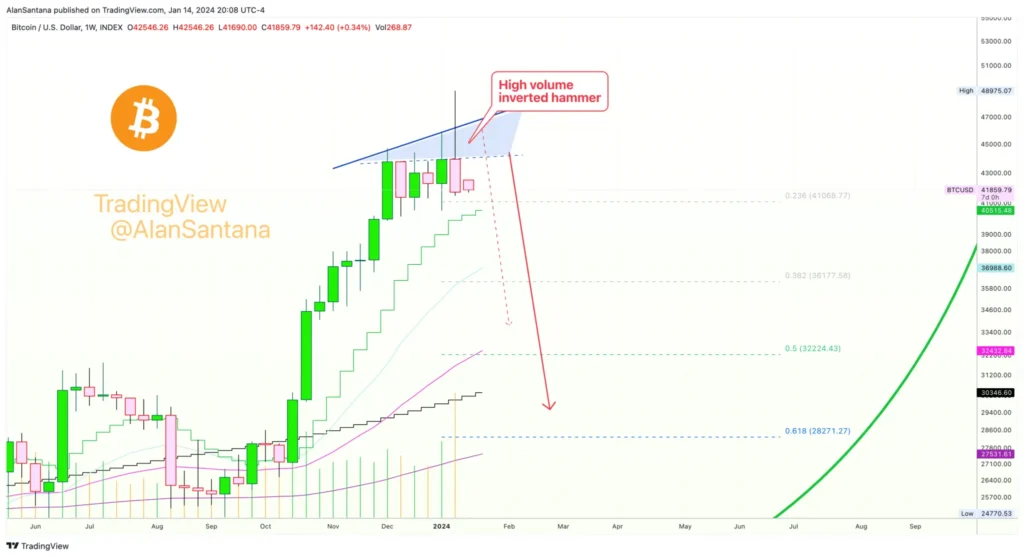 Bitcoin’e odaklanan uzman AlanSantana, TradingView gönderisinde önümüzdeki günlerde neler beklenebileceğine dair bir fikir paylaştı. Analist, Bitcoin’in haftalık mumu ters çevrilmiş bir çekiç olarak kapattığını, yani geçerliliği için bir trendin tepesinde görünmesi gereken düşüş yönlü bir mum çubuğu formasyonu olduğunu belirtti. Sinyalin yüksek hacim ve teyit ile daha güçlü olduğu değerlendirildi. Bu da analistin düzeltme potansiyelini %95/96 civarında bir olasılığa ayarlamasına yol açtı.