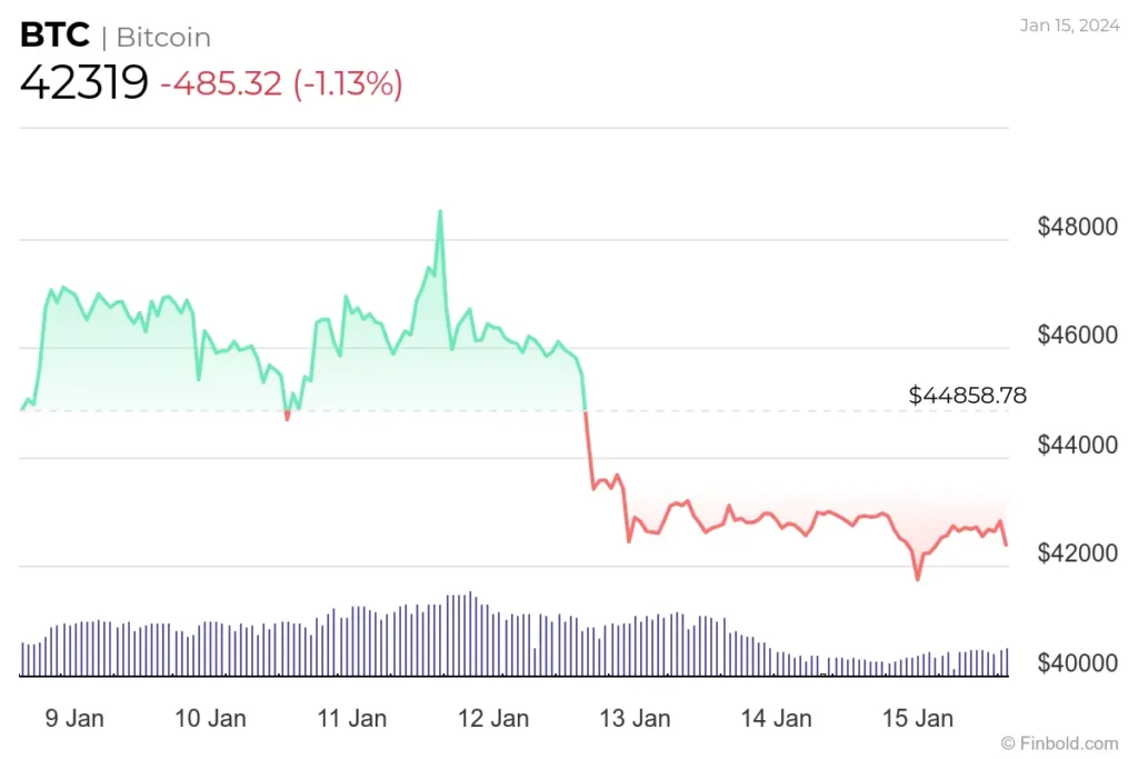 Yazının yayınlandığı sırada Bitcoin, son 24 saatte %1’in üzerinde düşüşle 42.319 dolardan işlem görüyordu; haftalık grafikte ise BTC %6 düşüş yaşadı.