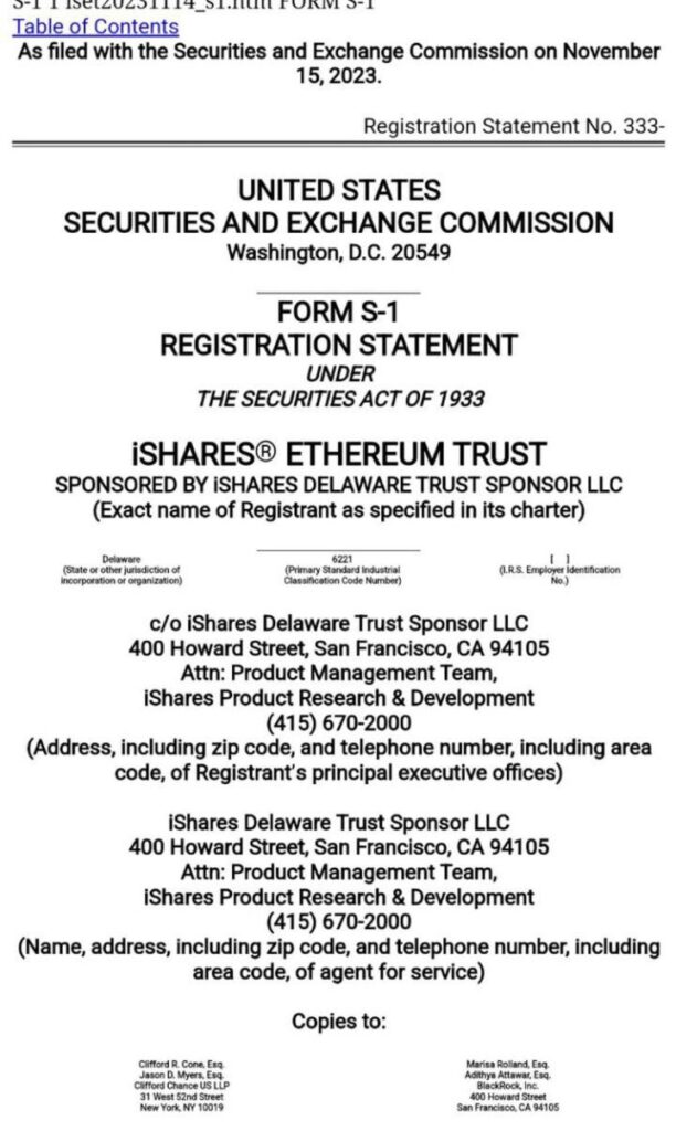 BlackRock, Amerika Birleşik Devletleri Menkul Kıymetler ve Borsa Komisyonu’na (SEC), Ethereum spot ETF için S-1 başvurusu yaptı.