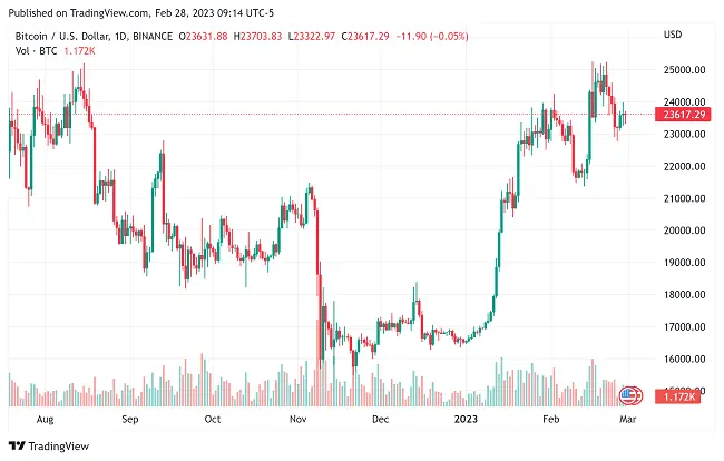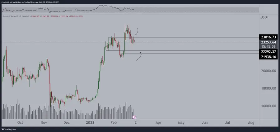 Şu anda Bitcoin, 23.500 doların üzerinde desteği sürdürmeye çalışıyor. Şimdilik 24.000 dolar önemli bir direnç seviyesi olarak hareket ediyor. Kripto uzmanı Michaël Poppe, Bitcoin’in dikkat edilmesi gereken bir sonraki önemli pozisyonlarından bazılarını vurguladı. 28 Şubat’ta bir tweet’te Poppe, Bitcoin’in 23.800 dolarlık desteği tersine çevirmesi durumunda kazanç için sıralanabileceğine dikkat çekti.