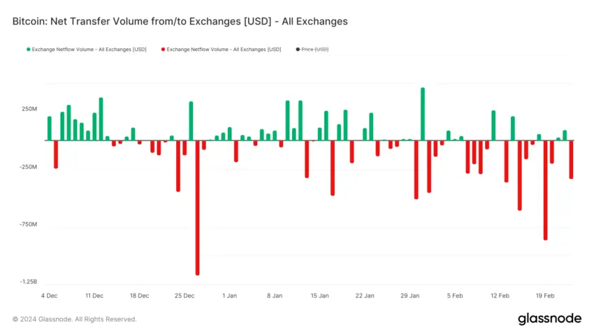 Önde gelen piyasa istihbarat platformu IntoTheBlock’un zincir içi verileri, merkezi borsalardan haftalık net çıkışların zirveye ulaştığını gösteriyor. Bu hafta yaklaşık 540 milyon dolar değerinde BTC çekildi ve bu, Haziran 2023’ten bu yana en büyük net çıkış oldu.