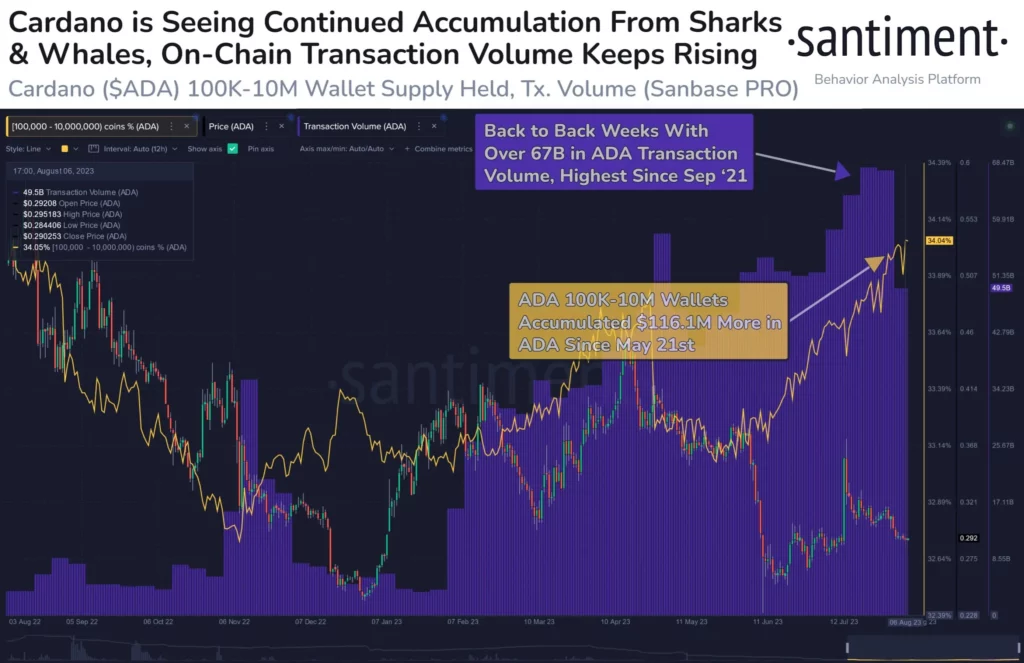 Bu kohort şu anda neredeyse bir yıl içindeki en yüksek ADA coini elinde tutuyor. Zincir içi veri sağlayıcısı Santiment, 100.000-10 milyon ADA’ya sahip büyük sahiplerinin Eylül 2022’den bu yana sahip oldukları en yüksek seviyeyi yeniden topladığını açıklıyor. son 6 aydır neredeyse her hafta yükseliyor.