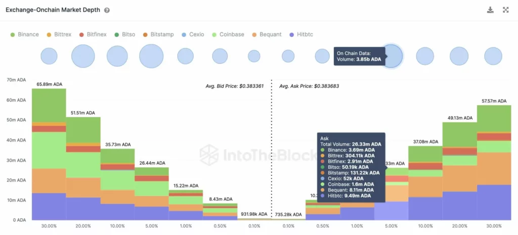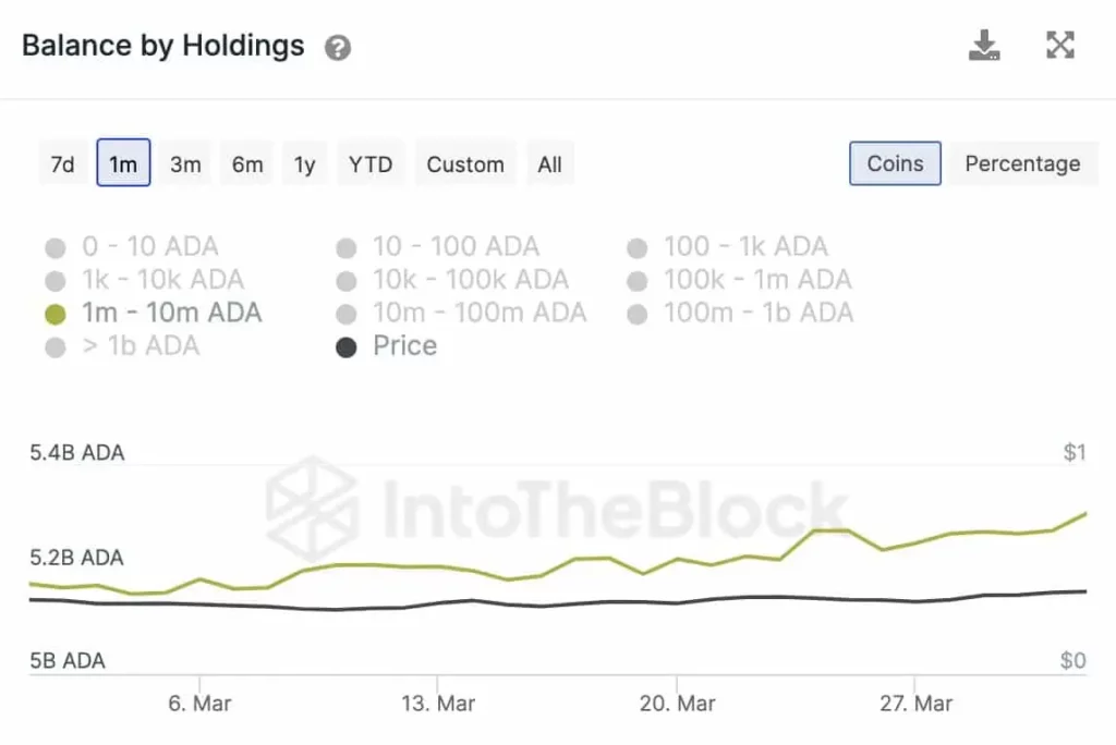 Ancak ADA son zamanlarda 0,40 dolar seviyelerinde güçlü bir dirençle karşı karşıya. Popüler kripto analisti Ali Martinez, IntoTheBlock’tan alınan verilere dayanarak ADA’yı ele aldı. Analist, ADA balinalarının geçen ay 57 milyon dolar değerinde 150 milyon ADA aldığını açıklıyor.