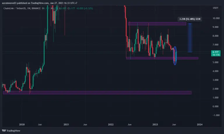 Mayıs 2022’den bu yana, Chainlink’in (LINK) fiyatı 5,5 ila 9,5 dolar aralığında işlem görüyor. Fiyat, büyük bir düşüş mumuyla 5-12 Haziran haftası aralığının altına düştü. Bu eylem, düşüş eğiliminin devam ettiğini gösterdi. Fiyatın potansiyel olarak bir sonraki destek seviyesi olan 1,5 $’a düşmesi muhtemel.
