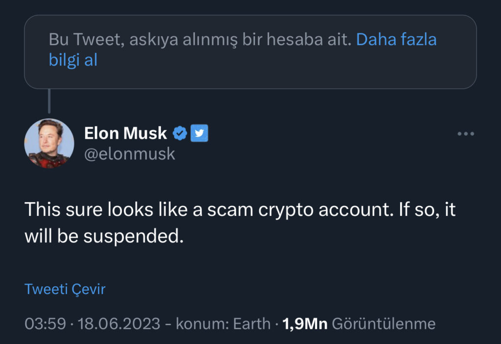 “Bu kesinlikle bir dolandırıcılık kripto hesabı gibi görünüyor. Eğer öyleyse askıya alınacak.”