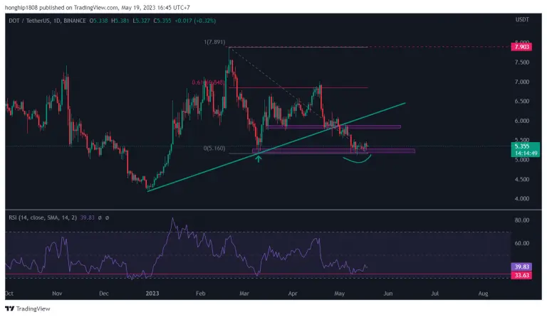 Gerçekten de, DOT fiyatı düşmeye devam etti ve 1 Mayıs’ta destek hattının ve yatay destek bölgesinin altına düşerek yükseliş trendinin sonunu işaret ederek 5.8$’a ulaştı. Bununla birlikte, aşağı yönlü momentum, yukarı yönlü pin çubuk mumlarının oluşmasıyla 5,2 dolarlık yatay destek seviyesinde durmuş görünmekte. Bu satın alma baskısının bir işaretidir. RSI göstergesi, tarihsel olarak toparlanmalara yol açan aşırı satış bölgesine yaklaştı.