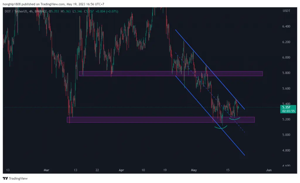 4 saatlik grafik, DOT fiyatının 5,8 $ yatay bölgenin altına düştüğünden beri alçalan bir paralel kanalda işlem gördüğünü gösteriyor. Bu, çoğu durumda kırılmalara yol açan bir yükseliş modelidir. Ayrıca DOT fiyatı, 5,2 dolarlık destek seviyesinden sıçradıktan sonra daha yüksek bir dip oluşturdu. Bu nedenle, belirtildiği gibi mevcut formasyonun üzerine çıkıp 5,8 dolar bölgesine hareket etme olasılığı var.