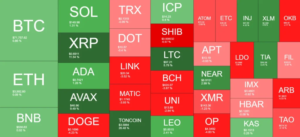 Lider kripto para biriminin birkaç bin bin artarak neredeyse 73.000 dolara sıçramasıyla Pazartesi günü daha fazla kazanç elde edildi ve tüm zamanların en yüksek seviyesini gördü. O zamandan bu yana bir miktar değer kaybetmesine rağmen BTC hala 71.000 doların oldukça üzerinde işlem görüyor. Piyasa değeri 1,4 trilyon doların kuzeyinde yer alıyor ve bu da onu dünyanın en büyük 8’inci finansal varlığı haline getiriyor. CoinGecko’da altcoinler üzerindeki hakimiyeti %50’ye yakın.