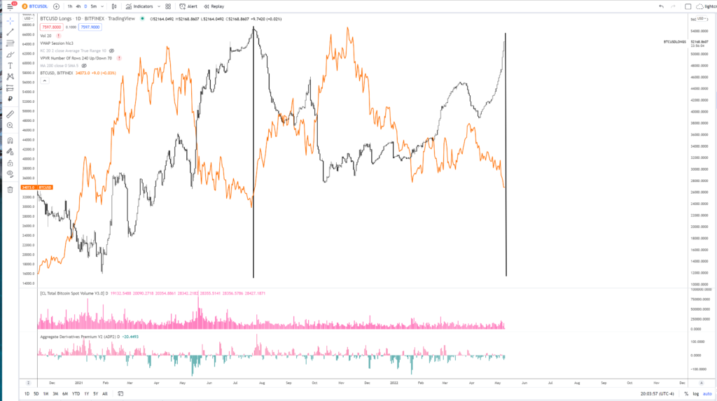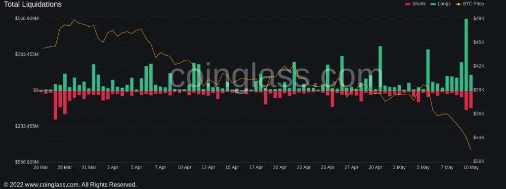 Analist ayrıca deneyimli tüccarların BTC’nin mevcut fiyatından long pozisyonlar oluşturduğunu söylüyor. Light, kripto borsası Bitfinex’teki long pozisyonların tüm zamanların en yüksek seviyelerine yükseldiğini aktardı. CryptoQuant’tan elde edilen veriler, panik kripto pazarlarını ele geçirirken döviz rezervlerinin artmaya başladığını gösterdi. Sürekli bir düşüş eğilimi gördükten sonra, büyük borsalardaki BTC miktarı tekrar artmaya başladı. 21 büyük borsanın bakiyesini izleyen CryptoQuant’a göre, satıcılar 6 Mayıs’tan 9 Mayıs’a kadar hesaplara toplam 37.537 BTC gönderdi. Bitcoin, yazı yazılırken 32.200 dolardan işlem görüyor. Bununla birlikte kripto para, son 24 saat içinde %9’dan fazla düştü. Son olarak Coinglass’tan alınan rakamlara göre, Bitcoin’in 30.000 doların altına düşmesi ile 1 milyar dolardan fazla pozisyon liq oldu. Bunların çoğu altcoinlerden gelen long pozisyonlardı.