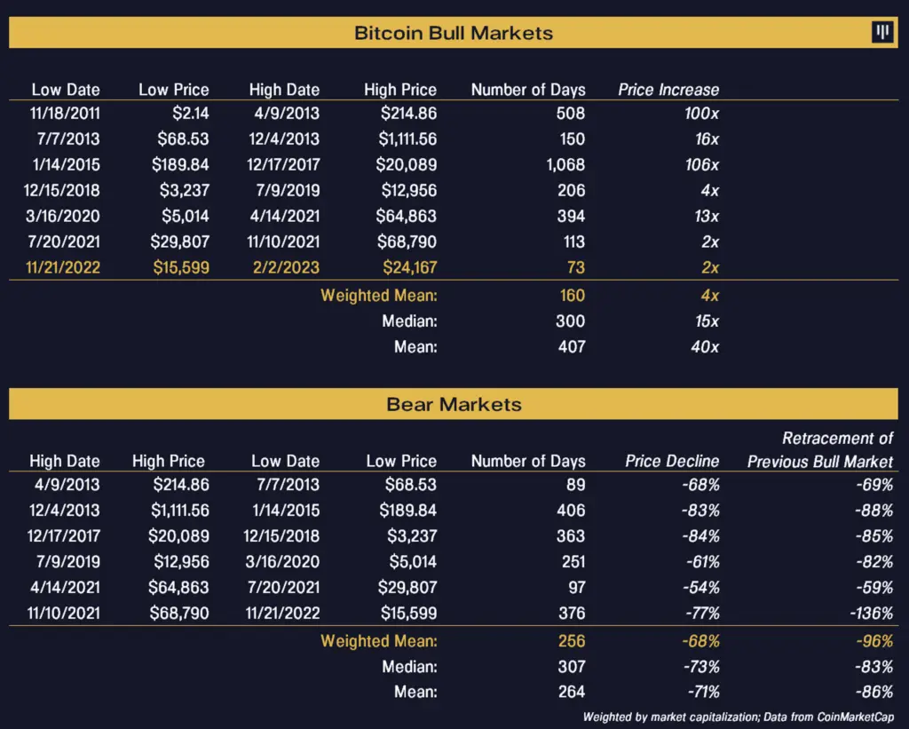 Yakın tarihli bir haber bülteninde Pantera, en son kripto ayı piyasasının 21 Kasım’da sona erdiğini ve toplam 376 gün sürdüğünü belirtti. Bu da 307 günlük medyan ayı piyasası uzunluğundan daha uzun sürdüğünü iddia ediyor. Pantera’nın yatırım ortağı Sehaj Singh, Bitcoin’in (BTC) bu süre içinde %77’lik bir düşüş gördüğünü belirtiyor.