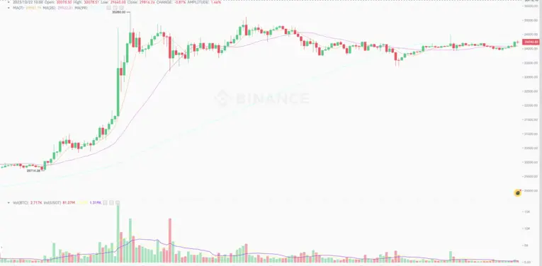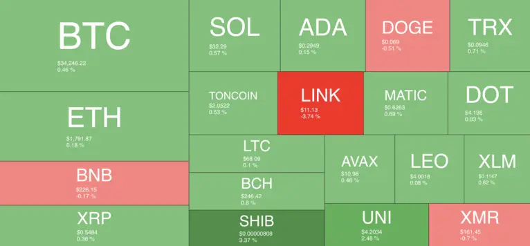 Son 24 saat, 34 bin doların üzerinde kalmayı başaran Bitcoin fiyatı açısından iyimserdi. Aslında BTC bir itme girişiminde bulundu ancak yukarı yönlü baskıyı sürdüremedi. Şu anda (Binance’de) 34.200 dolar civarında işlem gördüğü yere geri döndü. Aşağıdaki grafikte görüldüğü gibi fiyat, 35 bin dolara yükselmesinin ardından son birkaç gün boyunca istikrarlı bir konsolidasyon aşamasından geçiyor.