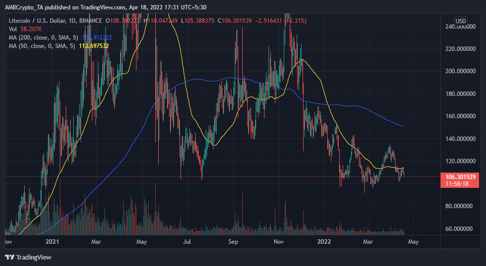 LTC, son gün içinde %4.43 artış kaydettikten sonra yazı yazılırken 110.93 dolardan işlem gördü. Şimdiye kadar, 30 Mart’taki en son yerel zirvesi olan 134 dolardan yaklaşık %15.21 geri çekildiğini gördük. Mevcut fiyat etiketi, 2022’nin en düşük seviyesi olan 91$’dan çok da uzak değil. Bununla birlikte, 411 dolarlık tarihi ATH’sinden tartışmalı bir şekilde aşırı satıldı.