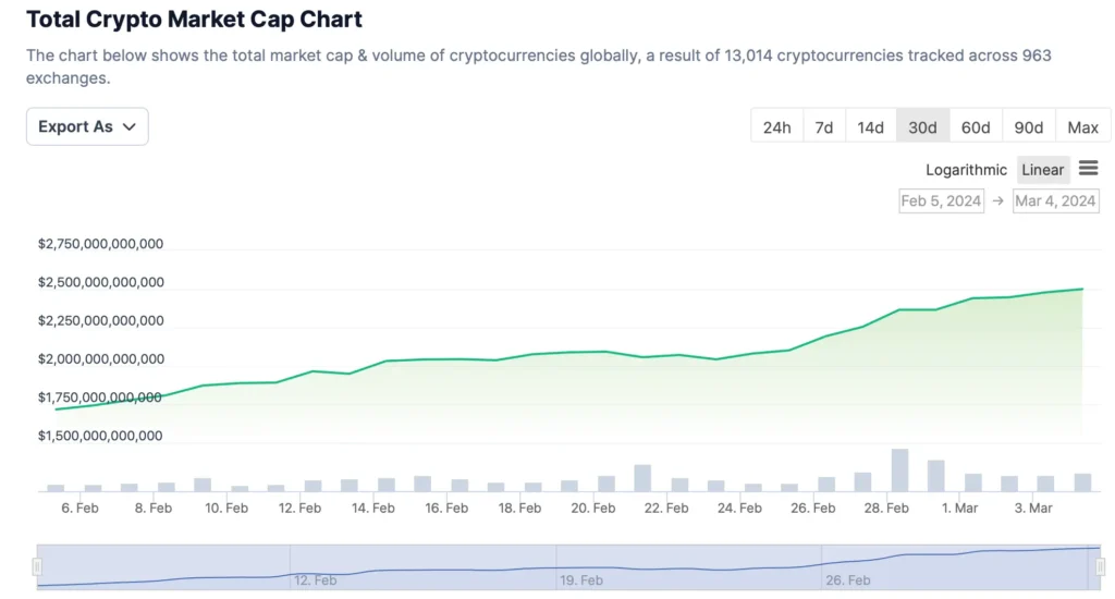CoinGecko’nun son verileri, kripto para piyasasının değerinin 2,5 trilyon doları aştığını gösteriyor.
