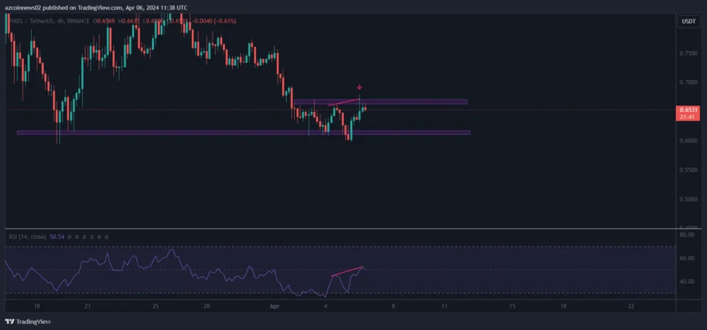 4 saatlik grafik, PIXEL fiyatının bugün 0,67 dolar seviyesindeki küçük bir yatay direnç bölgesi tarafından reddedildiğini gösteriyor (kırmızı ok). 4 saatlik RSI, genellikle düzeltmelerden önce ortaya çıkan düşüş eğilimi yarattı. Bu nedenle PIXEL fiyatının 0,62 dolarlık bölgeyi yeniden test etmesi muhtemel.