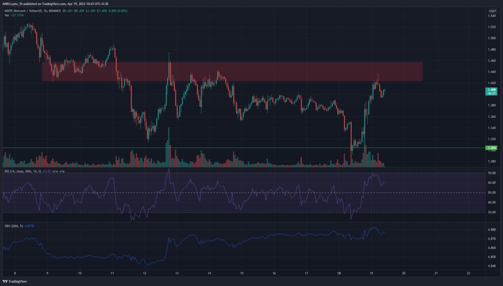 MATIC fiyat hareketi de düşüş eğilimine sahip. Dogecoin gibi MATIC de güçlü bir direnç bölgesine yaklaştı. Yükseliş momentumuna sahip olmasına rağmen, MATIC 1.44 $ direncini aşmak için bir BTC itici hareketine ihtiyaç duyulabilir. Boğalar için iyi haber şu ki, geçen hafta OBV bir dizi daha yüksek dip ve daha yüksek zirve yaptı. OBV’deki bu yükseliş eğilimi, güçlü satın alma hacminin göstergesidir. Dolayısıyla, gerçek talebin varlığı MATIC’i daha yükseğe itebilir.