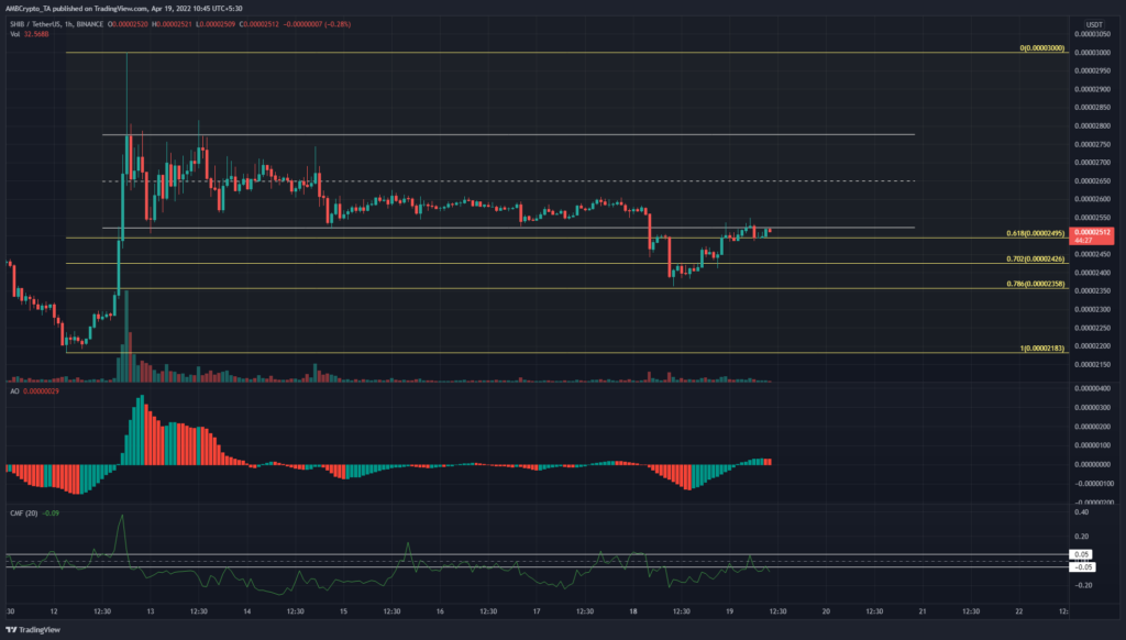 Beyaz, SHIB‘nin yaklaşık bir hafta boyunca işlem gördüğü bir aralıktır. Özellikle 0,0000255 dolarlık düşük aralık, son günlerde çok fazla yatay işlem gördü ve muhtemelen geri dönüş yolunda SHIB’ye direnç gösterecek. Müthiş Osilatör, 0.0000236 dolarlık alandan gelen sıçramanın ardından sıfır çizgisinin üzerine çıktı. Öte yandan, bu sıçrama CMF’yi +0.05 işaretinin üzerine çıkarmaya yetmedi. Bunun yerine, pazardan güçlü sermaye akışını göstermek için kararlılıkla -0.05’in altında kaldı.