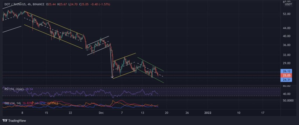 DOT, 11 Aralık’ta bir düşüş trendine girdi ve aşağı yönlü (yeşil) giden paralel çizgiler arasında hareket etti. Bu düşüş, fiyatı 26.12 dolar seviyesinde 15 haftalık direncin altına iten ATH’ye ulaşmasından bu yana üçüncü büyük geri çekilme oldu.