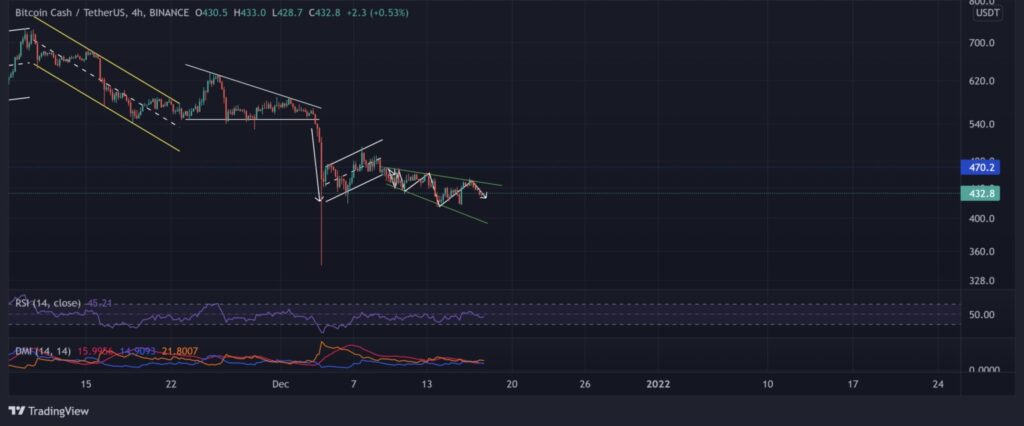 Son birkaç gün içinde, altcoin, azalan genişleyen bir kama (tersine dönüş paterni) içerisinde. Ayrıca son 24 saatte %4,17’nin üzerinde düşüş yaşadı. Basın zamanında, BCH ATH’sinin %88,6 altında 429 dolardan işlem görmektedir. RSI zayıf sinyaller veriyor.