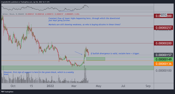 Analist, Twitter hesabından yaptığı paylaşımlar ile Polygon (MATIC), VET, GRT ve ONE olmak üzere bu dört altcoin’deki güncel teknik görünümleri değerlendiriyor. MATIC/BTC paritesine bakan analist, piyasadaki düşüş eğiliminin devam etmesi durumunda MATIC adına 0.00003184 BTC seviyesinin bir alım fırsatı olduğunu söylüyor. Bitcoin (BTC) ile eşleştirildiğinde, kripto analisti, 0.00003184 BTC seviyesinde bir MATIC satın alımını gözlediğini söylüyor. Sıradaki tedarik zinciri yönetimi blok zinciri VeChain (VET). Analist, VeChain (VET) adına da kritik fiyat seviyelerini aktarıyor. 0.00000149 BTC seviyelerinin kritik olduğunu ve bu seviyelerin aşması durumunda yükseliş başlayacağını dikkat çekiyor.