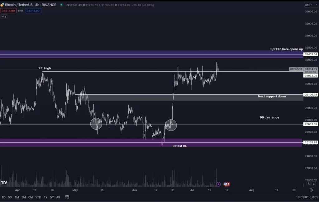 “BTC, iki hafta içinde bulunduğumuz aralığa geri dönerse, sonunda 28.000 dolara düşüşü arayacak ve bunu bir sapma olarak değerlendirecek.”