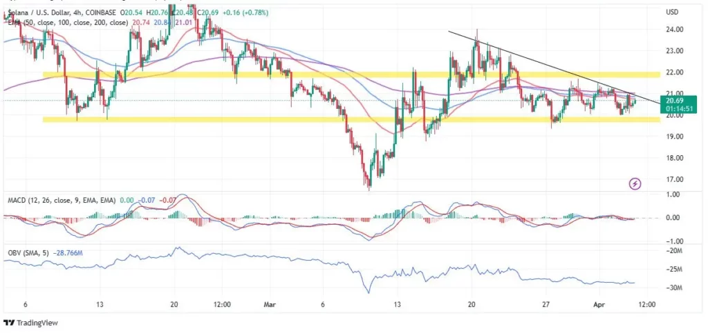 Bu arada, Solana fiyatı, dört saatlik zaman dilimi tablosunda görüldüğü gibi, teknik görünümüne dayalı olarak başka bir önemli kırılmaya hazırlanıyor. 20,00 $’daki destek, yükseliş trendini sağlam tutacak kadar güçlü. Özellikle de SOL, 20,72 $’da zemini tutan 50 günlük EMA (kırmızı çizgi) dirençle mücadele ederken.