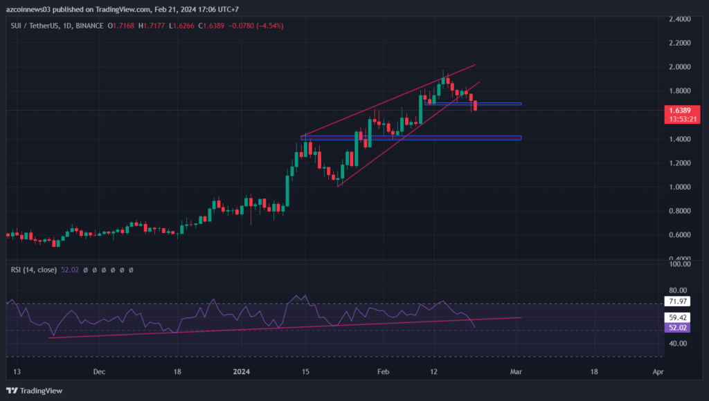Haftalık RSI 70’in altında ve aşağı doğru eğiliyor. Bu da başka bir zayıflık işaretidir. SUI düşmeye devam ederse, izlenmesi gereken önemli destek bölgesi mevcut fiyattan %24,39 daha düşük olan 1,25 dolardır. Günlük grafik, haftalık zaman dilimine göre daha fazla düşüş sinyali gösteriyor. Ayrıca son iki günde token fiyatı kısa vadeli yükselen takoz modelinin ve 1,7 dolarlık yatay destek bölgesinin altına düştü. Bu, ayıların kısa vadede kontrolü yeniden ele geçirdiği anlamına gelmektedir. Günlük RSI yükselen destek trend çizgisinin altına düştü. Aşağı doğru eğim yaparak daha fazla düşüşü destekliyor. Bu nedenle SUI fiyatının önümüzdeki günlerde 1,40 dolar destek bölgesine gitmedi muhtemel duruyor.