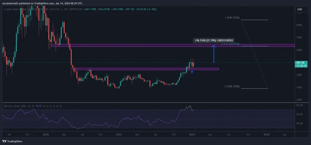 Haftalık RSI (Göreceli Güç Endeksi) aşırı alım bölgesine girdi ancak herhangi bir düşüş eğilimi yaratmadı. Bu durum boğaların hala piyasayı kontrol altında tuttuğunu gösteriyor. Bu nedenle TOTAL3, önceki destek bölgesi ve 0,618 Fibonacci geri çekilme seviyesinin oluşturduğu 630 milyar dolarlık bir sonraki önemli direnç bölgesine doğru yükselmeye devam edebilir. Bu rakam mevcut fiyata göre %27,79’luk bir artışa karşılık geliyor.