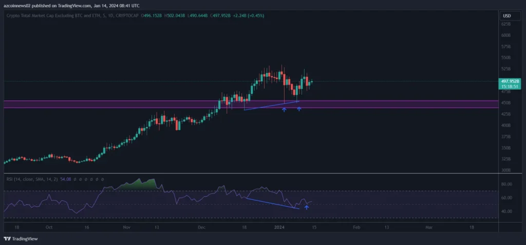 En olası senaryo TOTAL3’ün yakın gelecekte artmaya devam edeceğini gösteriyor. Bu hareketin potansiyel hedefi ise 630 milyar dolar. Bu seviyeye ulaşmak birçok altcoin için yeni bir patlamaya işaret edecek. TOTAL3’ün 445 milyar dolarlık bölgenin altına düşmesi durumunda yükseliş görünümü geçersiz hale gelecektir.