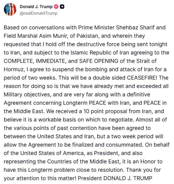 “İran’a yönelik bombalama ve saldırıları iki haftalık bir süre için askıya almayı kabul ediyorum. Bu, iki taraflı bir ateşkes olacak.”