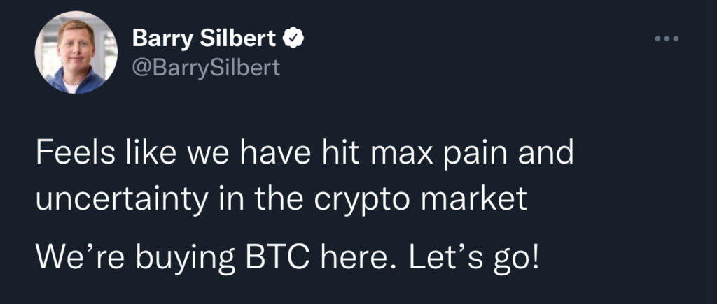 Bitcoin’in (BTC) düşüşüyle beraber kripto para sektörü oldukça kötü bir zamandan geçiyor. Birçok önemli isim sektör hakkındaki görüşlerini açıkladı. Bununla birlikte yaşanan bu düşüşü fırsata çevirmek isteyenlerden birisi Digital Currency Group CEO’su Barry Silbert oldu. Digital Currency Group CEO’su Barry Silbert, yakın tarihli bir tweet’te Bitcoin satın aldığını açıklayarak kripto para birimi boğalarının moralini yükseltti. Silbert, pazarın şimdiden “maksimum acıya” ulaştığına inanıyor. Barry Silbert, BTC satın aldığının haberini ise şu şekilde paylaştı: